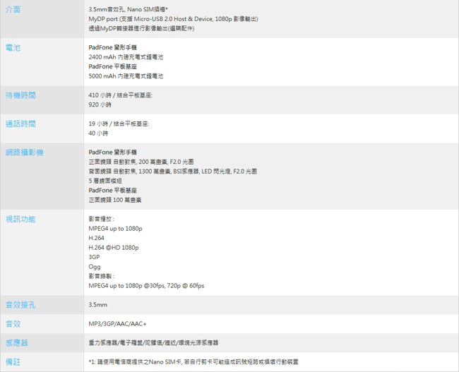 手機尺寸143.5 x 72.8 x 8.9 mm,重量為145g;平板基座部分尺寸為264.6 x 181.6 x 10.6 mm,重量為532g。電池容量部分手機為2400mAH,在平板上還內建了5000mAH的電池,官方提供的通話時間手機部分為19小時,與平板結合後,可延長至40小時。以日常使用來說,在3G 與 WiFi開啟下,正常的通話,手機部分大概到晚上還有30%左右,如果加上平板,應該足足用兩天也不會有問題。