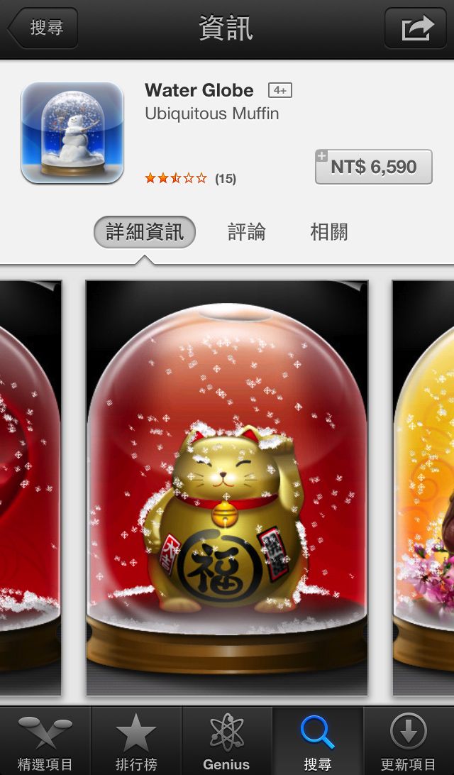 是的,大家沒看錯,這就是一款模擬雪花球的app- Water Globe。雖然說裡面有著各種可愛的擺設主題、可以搖晃裝置讓雪花依照不同重力與方向紛飛、可以用來設定當成桌布或是螢幕保護程式,但是…… 現實中的夢幻還是得建立在金錢上的, NT$ 6,590 買個夢幻,你覺得呢?