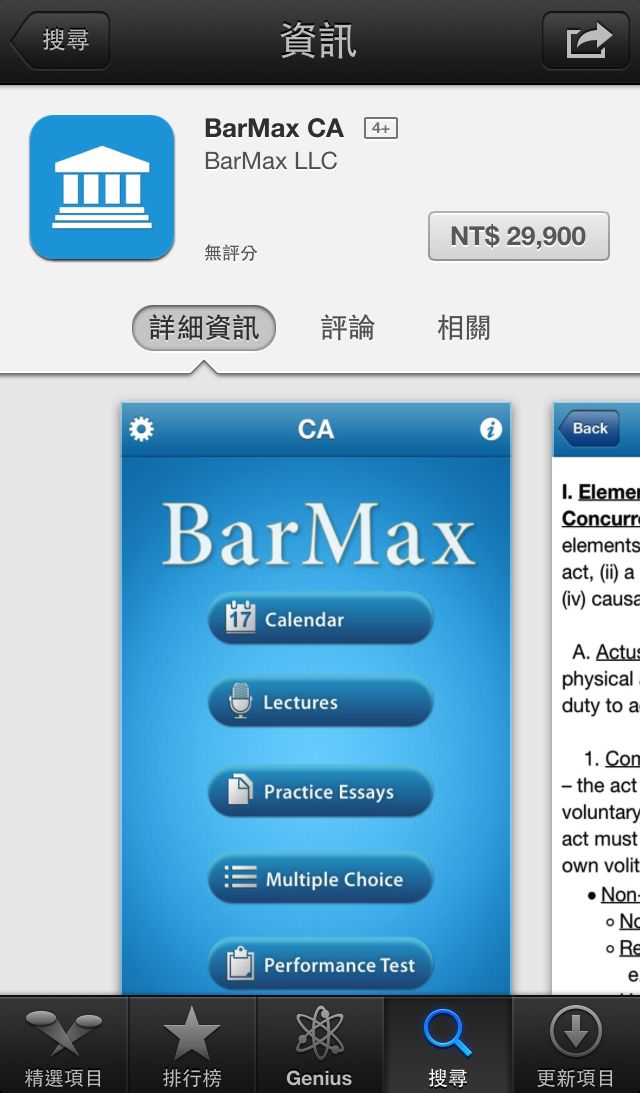 原來這個BarMax app 是專門針對要考律師執照的人所設計的。不僅創立者是哈佛法學院畢業的校友,旗下還有著目前全美國最大的律師證照補習班- BarBri 來為其撐腰。這個app 提供了加州(第二版為紐約州) 想要考律師證照的朋友50小時法學相關課程、歷年來考古題、法學相關問題咨詢等等服務。也許對我們來說這個價錢貴的嚇死人,可是從他推出加州版本後,迅速的又推出紐約版本可以看得出來,似乎還受到許多人的支持呢!更何況在美國一般要去BarBri補習班補習,可是要花費到台幣10萬以上,仔細想想,也許這將近3萬元的費用,並不是這麼樣的誇張!