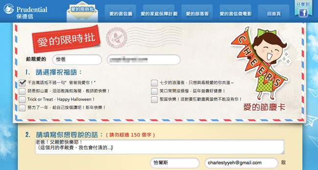 一樣也是簡單點選節慶的選項進去,跟剛剛一樣填入 Mail 的資訊,選個父親節用祝福語和加點貼心的話,就搞定囉!