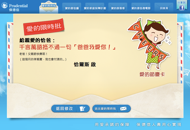 這裡分享個有趣又實用的 E-mail 小功能給大家,不用太擔心自己的文筆不好,藉由可愛的圖像和簡單的祝福話語,就能即時傳遞自己的關心給別人唷!保德信人壽的這個「愛的限時批」活動,我們可以將我們的「愛的鼓勵」,傳遞元氣給你所關愛的朋友或親人,隨時隨地都能傳遞愛的能量。