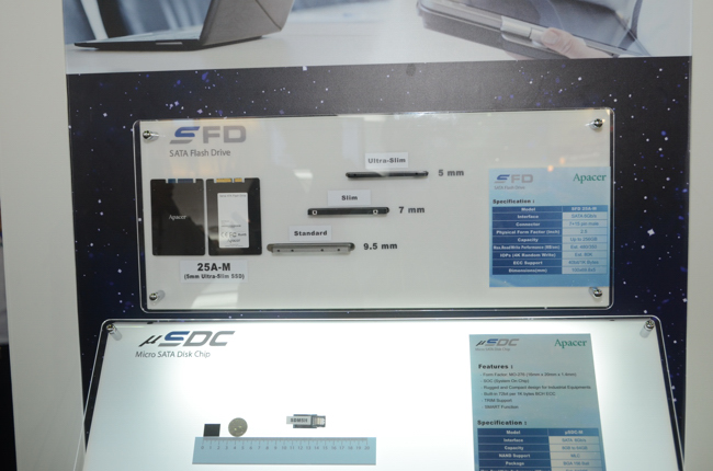 在速度方面,因為為了要滿足不同客戶的需求,在工業用的 SSD 這塊,宇瞻科技展出擁有 SATA3 傳輸介面的 Dual Drive 固態硬碟,讀取速度還能超越 1,000MB/sec。