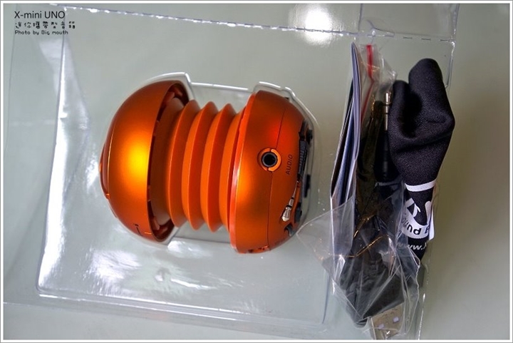 橘色的X-mini UNO迷你攜帶型音箱,正面有X-mini的LOGO,外攜採用霧面消光漆塗裝,上層雖是塑膠材質卻有著金屬質感,搭配時尚外型相當亮眼!
