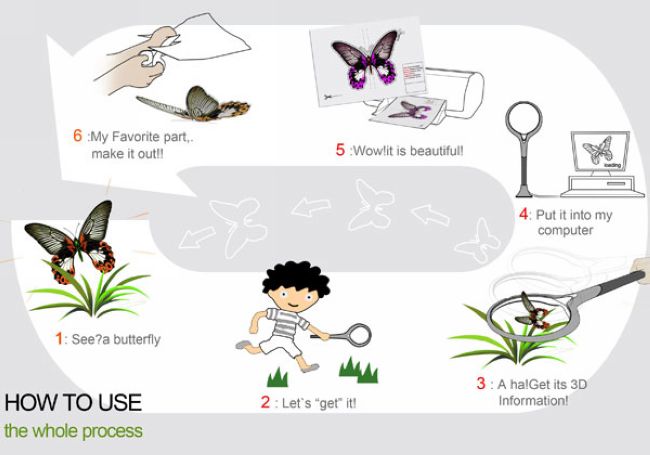 步驟非常簡單:1-看到蝴蝶、2-拿著Butterfly Catch、3-輕輕地讓蝴蝶穿越圓形3D掃瞄器、4-將Catch連上電腦、5-利用Catch專用軟體列印蝴蝶照片、6-再將蝴蝶剪下來。那麼小孩就擁有一隻栩栩如生的3D立體蝴蝶囉。