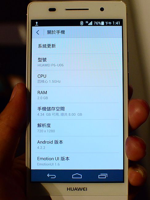 HUAWEI Ascend P6 採用 Android 4.2.2 作業系統,搭配HUAWEI 獨家 Emotion UI,獨家Me Widget則可讓使用者結合所需的資訊與功能,整合在單一且客製化的Widget中。