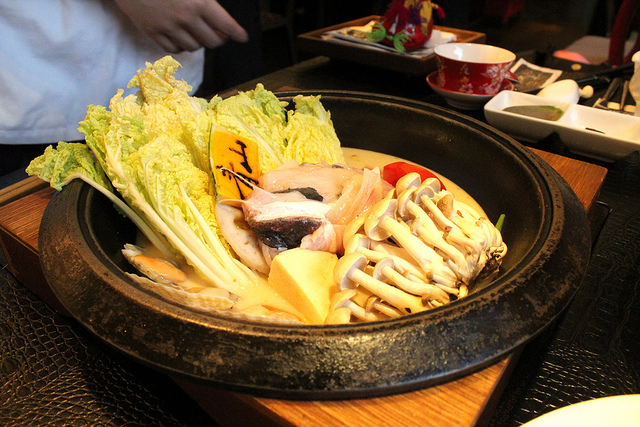 這道是海鮮養生牛奶鍋,有魚肉、扇貝、鴻喜菇、豆腐,趁它還沒冒煙先拍張照,剛剛採收下來的菌菇也在這裡一起煮,煮好後服務人員會幫大家盛在碗裡。