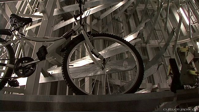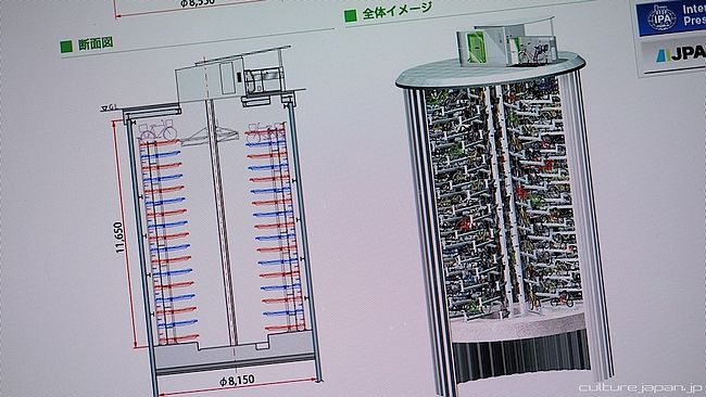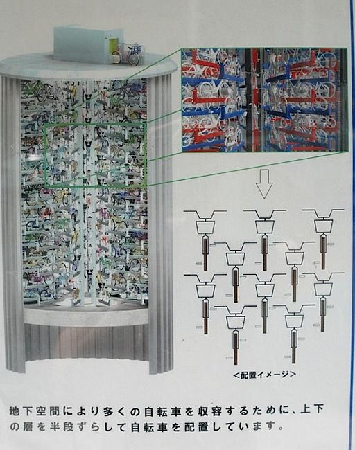 日本地狹人稠,連停腳踏車都快跟台灣停汽車一樣困難,所以日本人把停車場往地下延伸,每一座入口即代表地下有一座11公尺深的腳踏車停車場,可容納204輛腳踏車。