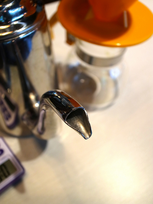 特殊的壺嘴設計,讓水滴可以穩定的滴落在咖啡粉上。