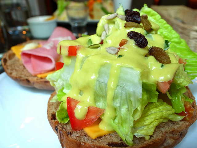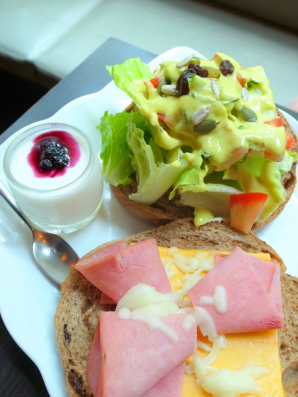 同場加映,爆漿起士巧達土石流貝果塔!黃澄澄的起司巧達醬裡混合著堅果雜糧葡萄乾,在新鮮生菜上傾瀉而下。是爺們就豪邁些吧,大口一咬,讓各種食材的味道在嘴裡恣意流動著,只是要稍微調整一下角度,可別讓噴發的醬汁爆漿到對面那位身上。