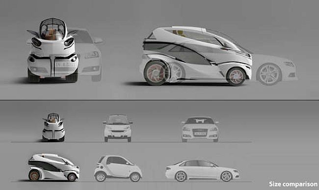 設計者考量城市擁擠的現況,設計一台可變形車輛,平常市區行駛時,長寬僅一般房車的三分之二,甚至在寬度上比Mini更嬌小,只是它僅限乘一人,以外型構造來說也是頗合理。