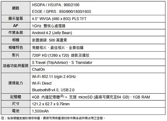 相較於前兩代的王牌機,GALAXY ACE 3在效能上亦同步升級,搭載1GHz雙核心處理器及和Android 4.2 (Jelly Bean)作業系統,讓操作更加流暢;配備五百萬畫素相機,簡單就能拍出優質照片。此外,在資料傳輸與分享上,GALAXY ACE 3支援三星獨家Wi-Fi Direct技術,讓檔案傳輸更便利;而搭載Bluetooth 4.0,也讓使用者享有更快速、省電、傳輸距離更遠的資料連結力;並可搭配Micro SD擴充高達64G的記憶體,還可享有Dropbox 50GB免費兩年儲存空間,讓檔案儲存減少負擔。