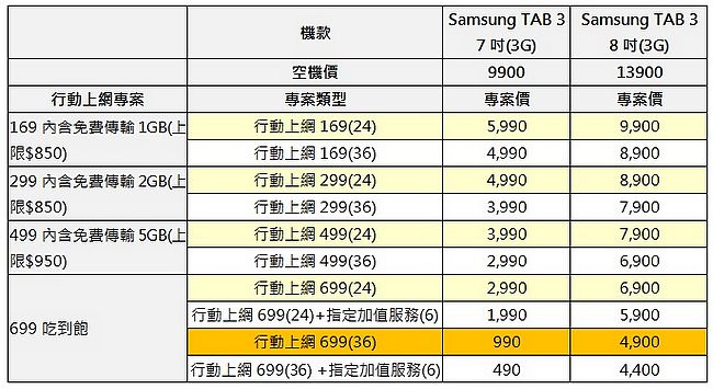 Samsung GALAXY Tab 3系列產品預計於七月下旬在全台各大通路販售,GALAXY Tab 3 7.0 Wi-Fi版售價NT$6,900元,3G版售價NT$9,900元;GALAXY Tab 3 8.0 Wi-Fi版售價NT$10,900元,3G版售價NT$13,900元;且消費者更可選擇搭配各家電信業者優惠方案,平板最低只要990元起。