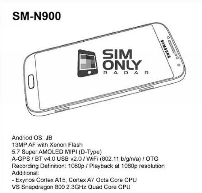 目前代號SM-N900的NoteIII持續流出手機資訊,包含5.7吋的AMOLED,解析度1920×1080 Full HD畫質,1300萬主相機鏡頭,規格也都與S4類似。