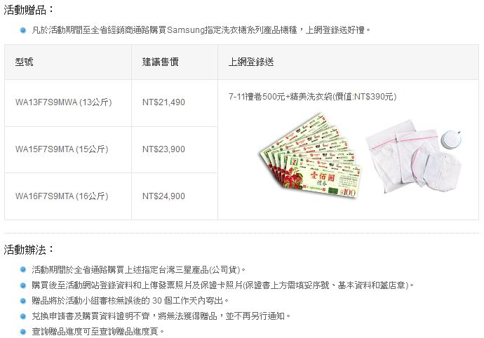 體驗過這台洗衣機後,感覺真的很不錯,都有滿足一個其實對家事不太在行男人的需求,或許真的可以考慮敗下這台洗衣機。從現在起到7/31號止,只要購買這台洗衣機上網登錄,就會贈送7-11禮卷500元+精美洗衣袋,有需要的朋友可以參考一下。