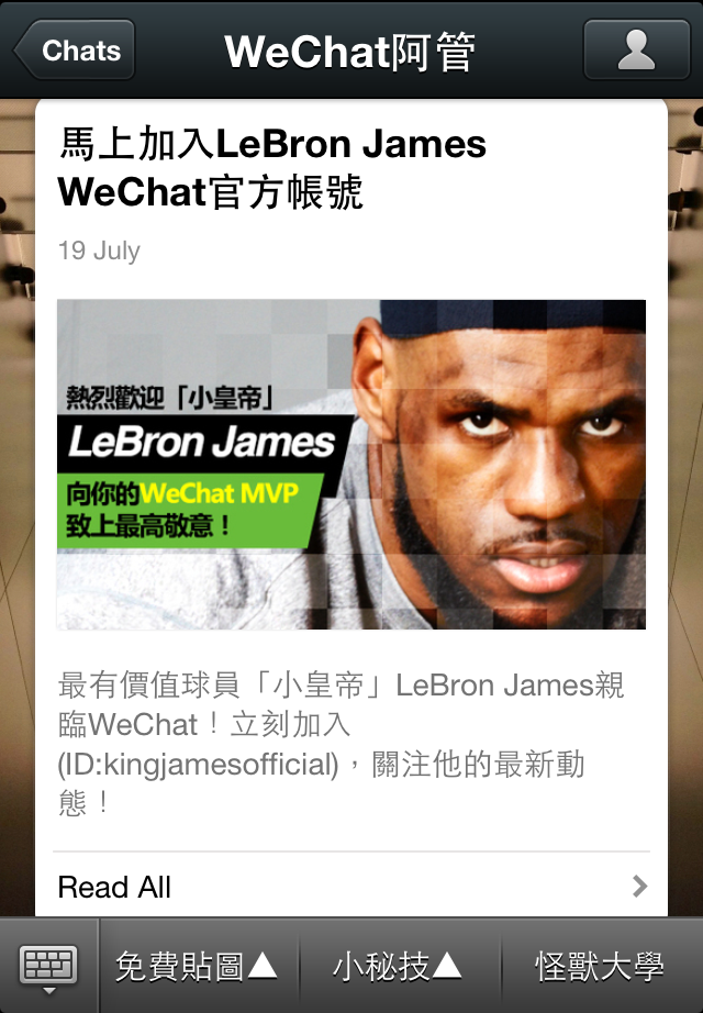 才在月初請來足球巨星梅西(Lionel Messi) 加入官方帳號的WeChat,這會兒又請來重量級的籃球巨星-“小皇帝” (LeBron James)加入WeChat這個大家庭囉!