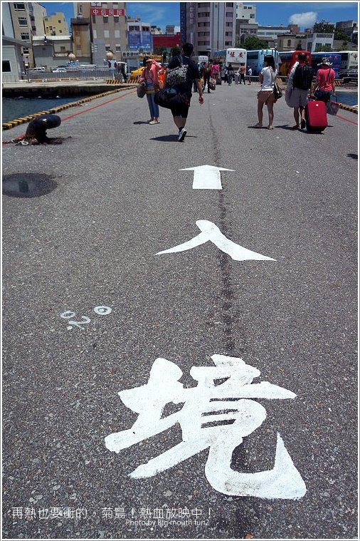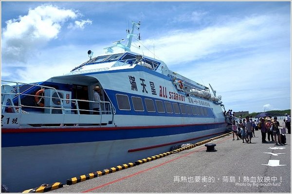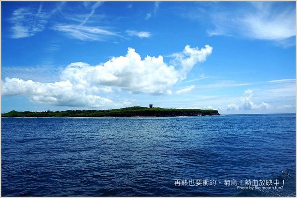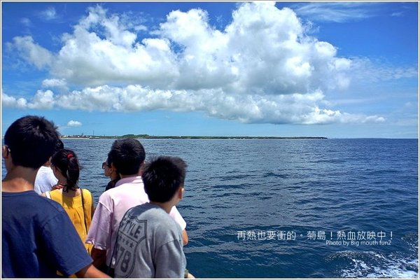 非常不巧,我們前往的日子就是這像是坐在海盜船的風浪,上上下下左左右右,就差沒有A跟B的亂搖(喂!離題啦!)這種狀況我見多了,前10分鐘遊客們還很 HI的覺得好玩,然後20分鐘後就開始嘔吐聲四起了,天阿!這大約80分鐘的航程,還有一小時呢!然後,骨子裡也很會暈船的大口,硬是忍住(內力果然夠 強),順利的看到菊島的一角了!