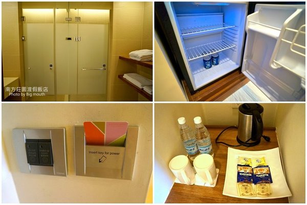 房內的浴室、廁所在門口右側,是兩間分離的獨立空間,另外小冰箱內附有兩罐運動飲料讓你泡湯完補充水分喝的,另外基本的咖啡、茶、小點心、熱水壺、礦泉水都有,
