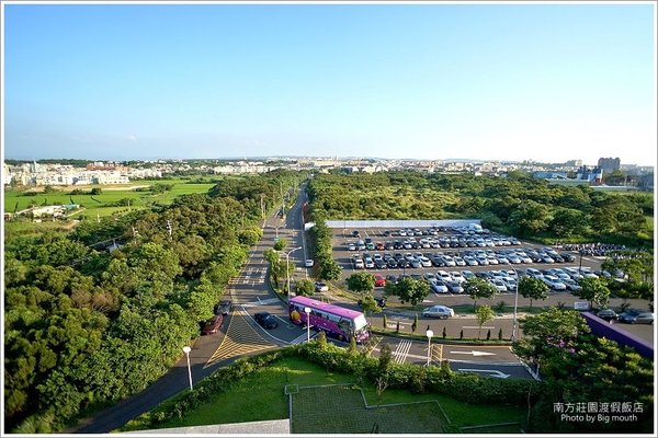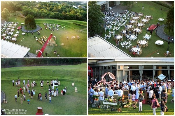 從飯店上方往下望,新人們的婚禮正好在飯店後方的大草原上,接近傍晚,左側的圓桌就是今晚舉辦星光BBQ的位置了,帶大家來去看看!