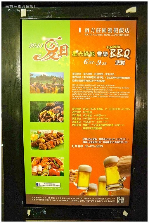 102年夏季於6/22~9/31止,推出了夏日星光綠地音樂BBQ,在夏夜涼爽的草原上用餐,不但有豐盛的BBQ無限供應,還有精彩音樂live饗宴,留宿南方莊園,體驗優質的湯泉,把最美好的服務一網打盡;鄰近桃園青埔高鐵車站,飯店提供高鐵、中壢車站專車接送,不論開不開車交通皆方便,這篇就是要帶大家來看看現正上映的星光饗宴!