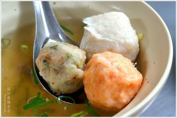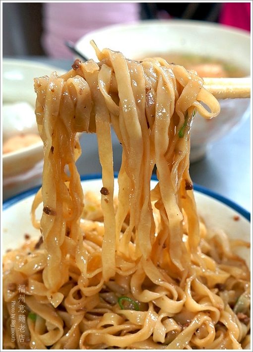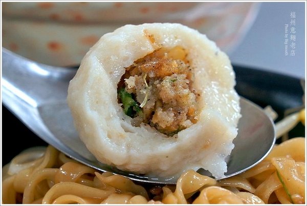 自製的薄寬意麵,是福州意麵老店家 傳三代的古早味,稍微Q彈的麵條淋上使用黑豬後腿肉絞成的肉燥,加上些許黑胡椒、青蔥,嘗起來滑順且香氣 四溢、美味值得一試!老闆為了方便客人,另外設計了套餐的形式,因此意麵配上綜和魚丸湯或餛飩湯成了這裡最熱門的點法;綜和魚丸湯內有蝦丸、旗魚丸以及大 顆的福州魚丸,各個口感Q彈而鮮美,湯頭採用大骨熬製,香醇夠味。