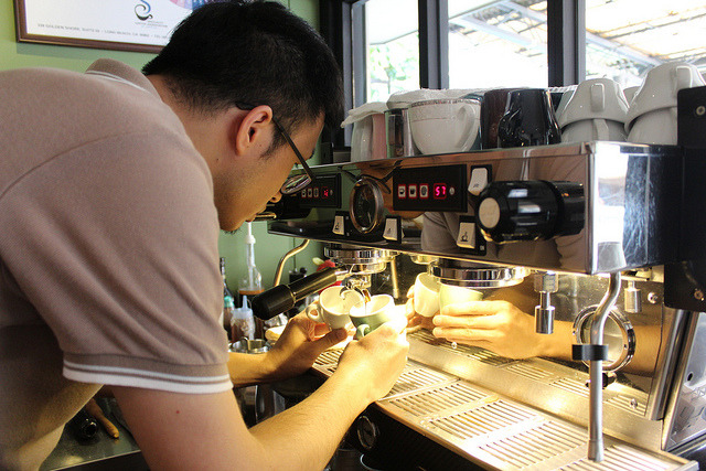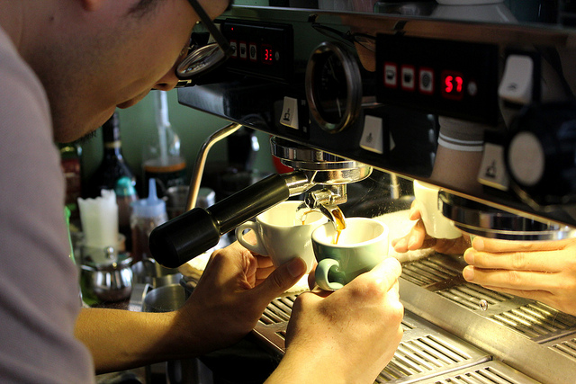 沛洛瑟咖啡店在製作 Espresso 的時候,所使用的是 La Marzocco Linea 雙孔義式咖啡機,經過改造而有著可調整壓力的功能。搭配著 ANFIM 磨豆機,以18公克濾杯,分流後萃取出單份濃縮咖啡的容量是23~25CC。