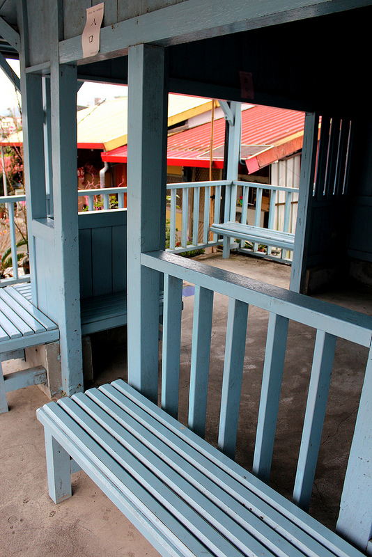 重新上漆的候車座椅,平日時一天都等不上一個人來坐。