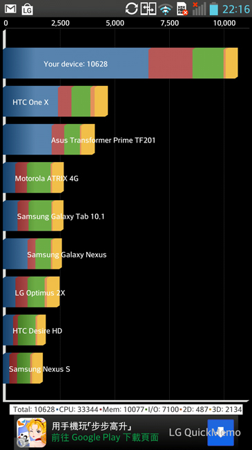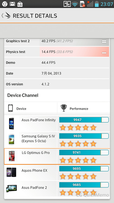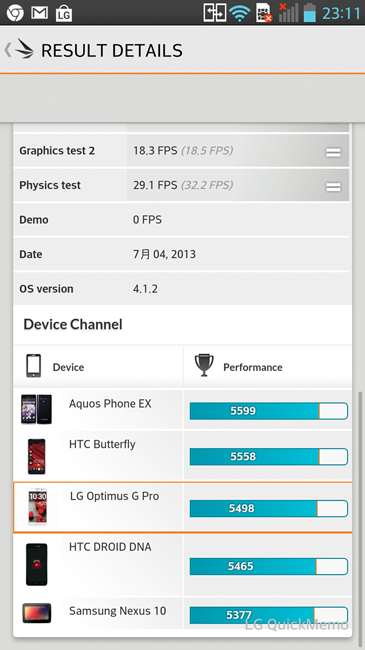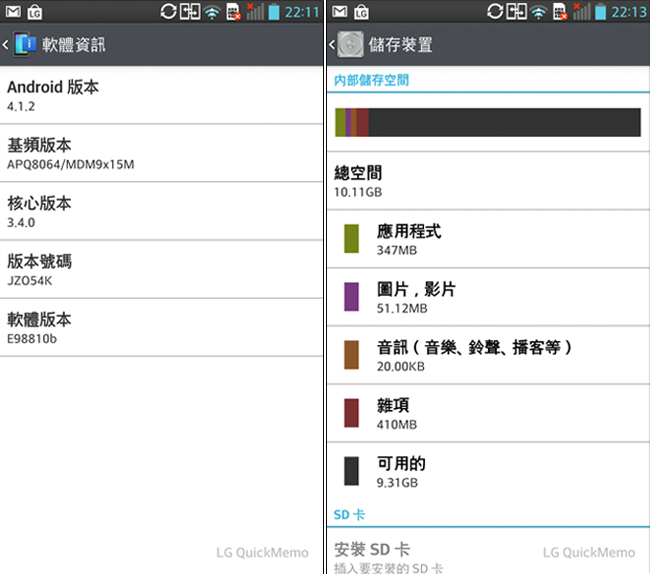最後應該還是要看一下硬體效能的部份,手邊這台 LG Optimus G Pro 的 Android 版本為 4.1.2,測試的部份供大家參考。測試時可以順道看一下系統的軟體資訊,再安裝相關的測試軟體,這次跑了 3DMark、NenaMark2 以及 Quadrant Standard 的版本,基本上 Optimus G Pro 在我們使用前,還留有10 GB 左右的空間可以用,真的是很 OK 了!
