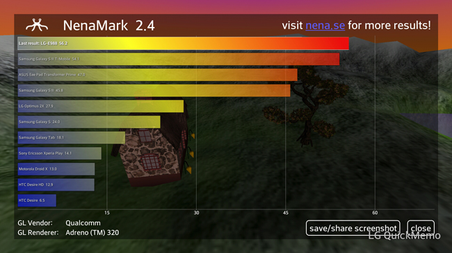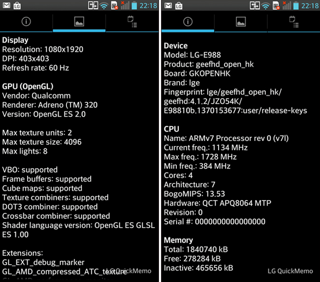 CPU 的表現時脈為 384MHz – 1728MHz,GPU 方面 Renderer 結果則是 Adreno 320。
