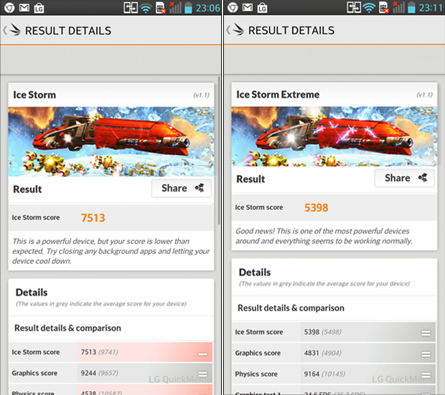 另外我們使用 3DMarks 進行測試,這裡分別使用 Ice Storm 和 Ice Storm Extreme 來跑分數,Ice Storm 的首次跑分為 7513,而 Ice Strom Extreme 跑的分數為 5398。