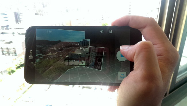 其中一個很棒的亮點就是「VR 全景」拍照,VR(Victual Reality)虛擬實境的拍照功能,能讓我們拍出跟過去更不一樣的全景模式,一般可能只有橫向的全景方式,但 Optimus G Pro 的 VR 全景可以直向和橫向的拍攝,讓視野更廣闊,這裡來測試一次給大家看看。在使用 VR 全景模式時,會先倒數 321 拍攝一張中間的照片,接著我們就可以往上下左右的方向移動,這裡建議慢慢地移動,效果會接得比較漂亮。