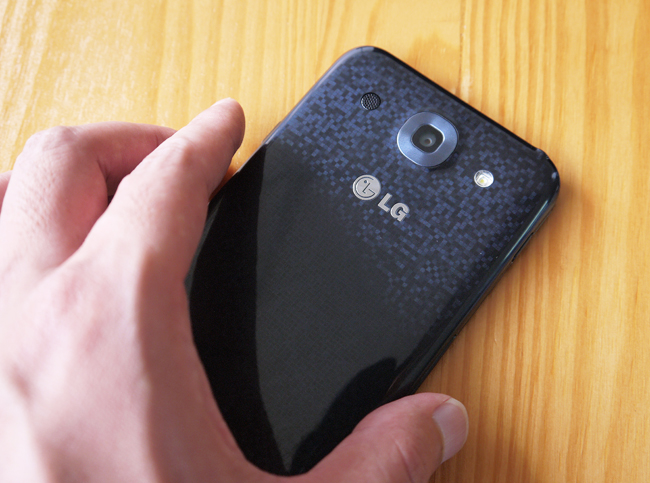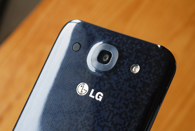 當然這裡絕不能忽視的就是 Optimus G Pro 的背蓋了,會因為光線的折射角度不同而變化,現場看起來是真的相當有層次感。背後的相機鏡頭為 1300 萬畫素,F/2.4,強大的攝影功能會在後面為大家介紹。而鏡頭,左邊為揚聲器,右邊則是 LED 輔助閃光燈。