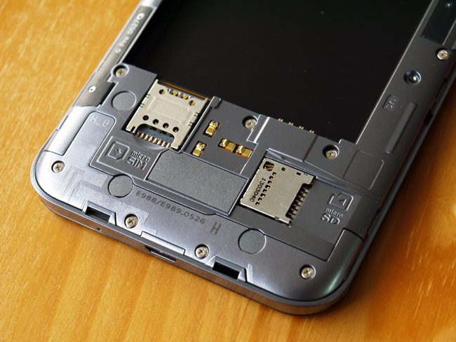底部則是 microSIM 卡槽,將電池拿出來才能進行更換,右邊則是 microSD 槽。