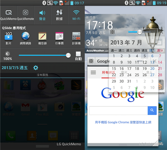另一個好用功能就是 QSlide 應用程式,主要提供了快速多工切換的功能,讓我們可以同時切換瀏覽器、影片、計算機、備忘錄、行事曆功能,將功能拉出到桌面呈現子視窗介面。視窗還可以自行調整其透明度,基本上包含原本執行的主畫面,可以同時開啟三個應用程式在同一個畫面。