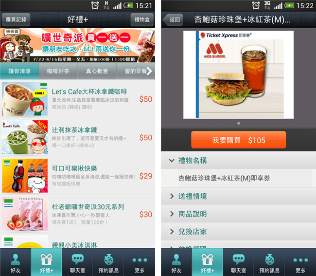 M+ Messenger 推出了這個「好禮+」功能,恰爾斯個人覺得實在非常厲害,居然可以透過 App 直接送「商品」給朋友,不僅僅是送個貼圖給朋友,更能讓朋友拿到實體的東西,有的直接到店家拿就可以囉!總覺得這個功能實在非常適合辦公室,三不五時我們總有些事情需要請同事幫忙,或者是有東西想請秘書幫我們跟上頭老闆催一下,不用親自提著 COCO 去拜託(什麼梗…),感覺真的太貼心了!