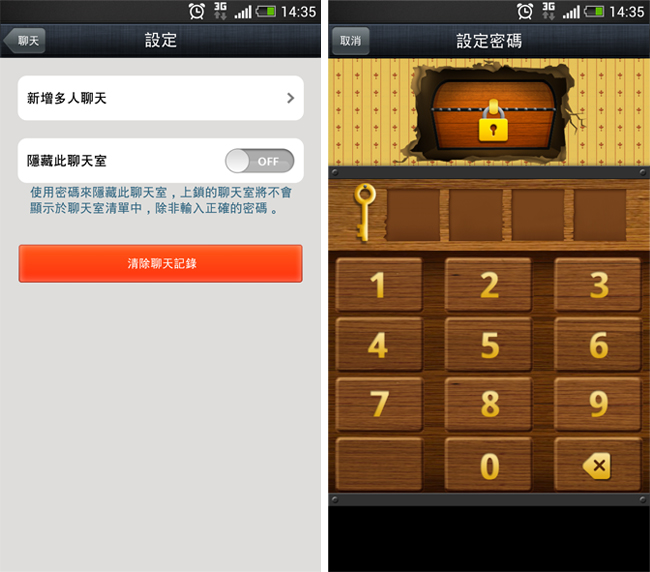 群組聊天室似乎是這類社群 App 都會有的功能,但是對於需要些隱私的朋友,M+ Messenger Messenger 就幫大家想到了這個功能,那就是隱藏聊天室的功能,讓我們平常的聊天內容不會被發現,就算手機一時借給別人,沒有藉由密碼解開,是看不到裡面的內容的,是個保護悄悄話的特殊功能囉!