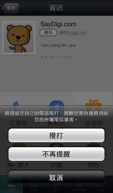 原來一般來說好友不是會將有在使用這個app的朋友列出來嗎?! 但M+ Messenger 還多增設了一個”聯絡簿”的選項,為使用者將手機中的通訊錄都列在其中,並且在電話號碼後方為你分析這門號究竟是屬於哪家電信業者。這時我們就可以決定到底要付網外通話費直接打給對方?還是省點錢用M+ Messenger的免費通訊功能或是文字視窗來對話就好呢!