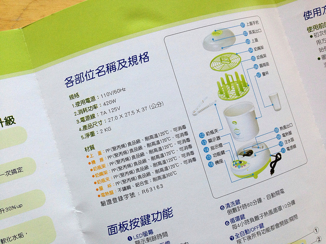 大致分為兩個部分,底座加熱器、上座奶瓶盛裝承架,加熱功率是420W,所以加入冷水按下開關後,馬上就產生出大量蒸氣!
