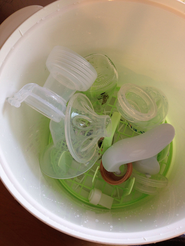 或是像這樣把手動擠奶器清洗後整個放進來奶瓶消毒鍋裡面。