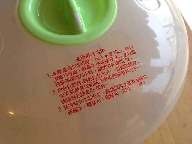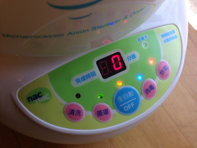 最後就把頂蓋蓋好按下開關,如果是全自動行程的話,就會先蒸氣八分鐘、烘乾30分鐘(可設定為10~60分鐘),至於循環功能則是固定每四個小時熱風烘乾10分鐘。至於"清洗"這個功能,指的是利用檸檬酸或食用醋來清洗加熱器上附著的水垢,而不是清洗奶瓶。