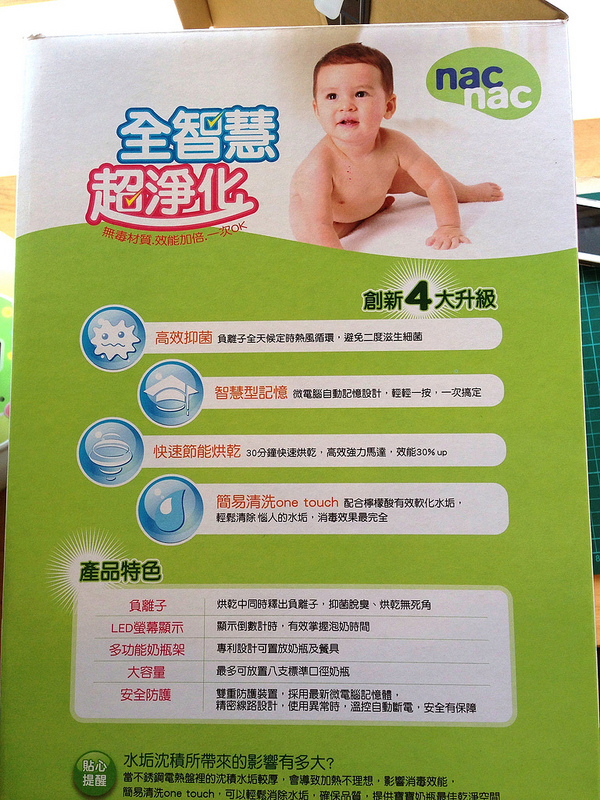 之前在月子中心就已經用過類似的奶瓶蒸氣消毒鍋,但是提供的是比較陽春的款式,只能產生熱蒸氣,用完還是濕淋淋的實在有點美中不足。所以這次在選購時特別考慮到烘乾功能,在臉書上也詢問了大家的意見,所以選擇了這台「nac nac 微電腦智慧消毒烘乾鍋」,先來看外箱包裝對於功能的說明吧~