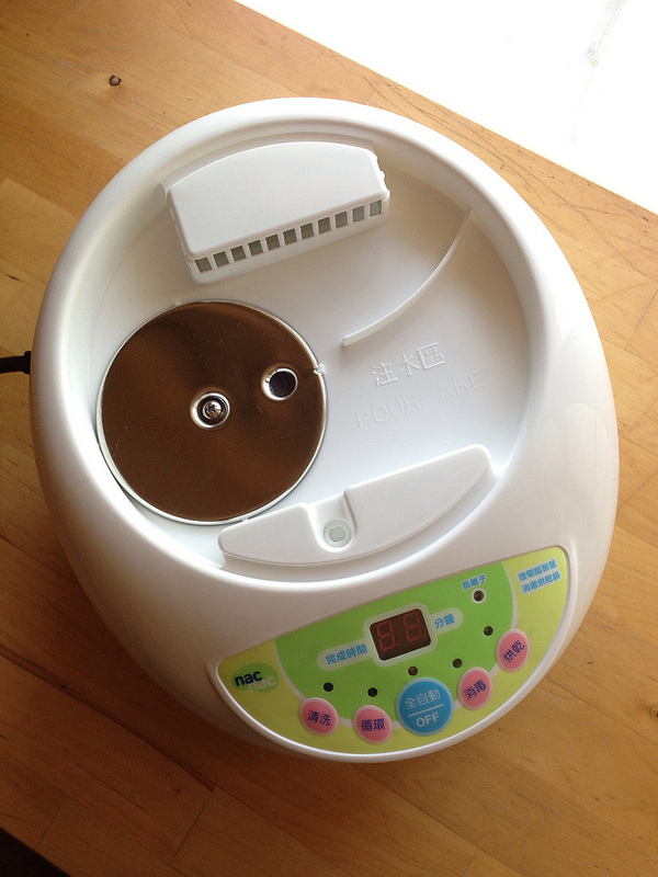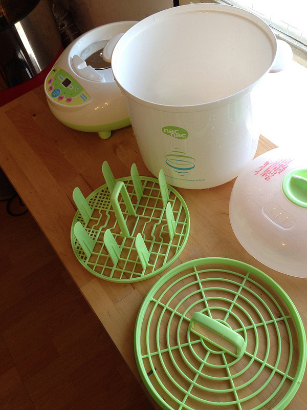 原本在蒸氣式和紫外線式這兩種消毒方式做考量,但在搜尋相關使用心得後,發覺紫外線會對於矽膠和塑膠類製品有所影響,會減短奶嘴的使用壽命。這樣的話,手動擠奶器就不能放進紫外線式的消毒器裡面。所以大叔選擇了這台nac nac 蒸氣烘乾消毒鍋,PCHOME 購物中心的售價不到兩千元,就能夠解決奶瓶消毒烘乾的問題,可說是相當划算。