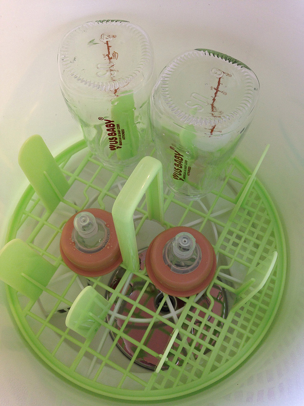 我們把奶瓶像是這樣倒扣著,讓蒸氣可以進入裡面殺死細菌。