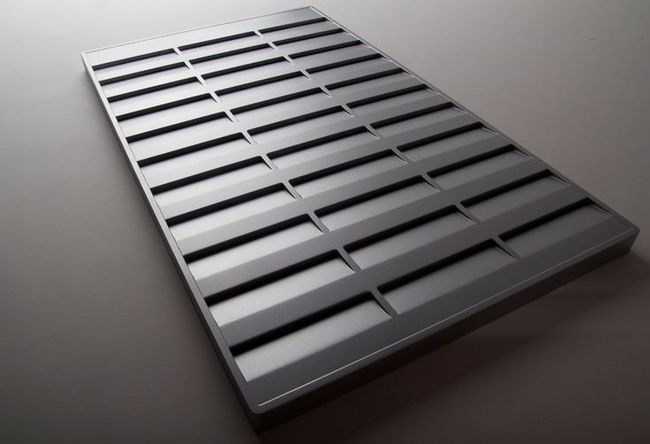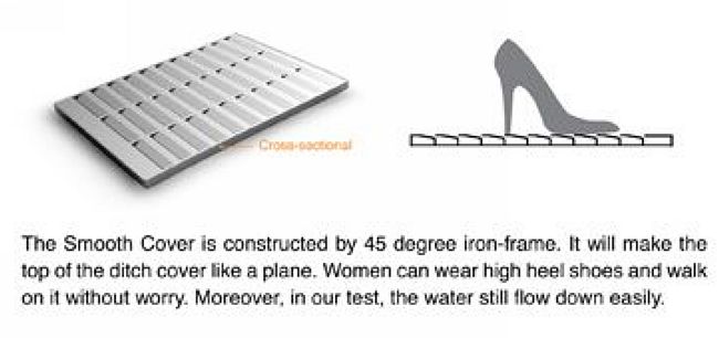 設計概念是將水溝蓋橫軸設計成30~45度角、密集間距為主,與一般水溝蓋為90度垂直、間距大不同,由於角度較為平緩,所以高跟鞋不易踩空卡住,造福了愛美的女性,想英雄救美的男性們可就沒機會了。