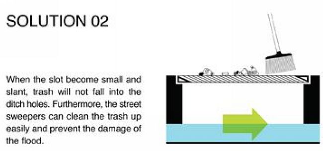 另外一個優點就是將橫軸變得密集,一定體積的垃圾也不會掉入排水溝,更不會造成堵塞,大雨一來水流就能順利渲洩。