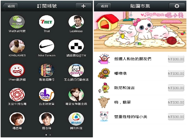 WeChat 5.0帶來跨行動社群平台之嶄新功能,如強化專屬使用者個人的「我的設定」的功能中,貼圖市集已支援線上支付功能,用戶可透過WeChat下載並購買特定的付費動態貼圖。WeChat 5.0「Sticker shop貼圖市集」目前上架包括超爆笑的飯糰人和他的朋友們,還有嘟嚕嚕、雙重性格喵小美等各種特色貼圖。WeChat同時也在「官方帳號」介面上進行全面改版,使用者關注之官方帳號將蒐錄於訂閱帳號中,頁面也變成圖像式icon,點選輕鬆方便,使用者還可拖曳排列自己喜愛的品牌帳號,強化個人化使用風格。