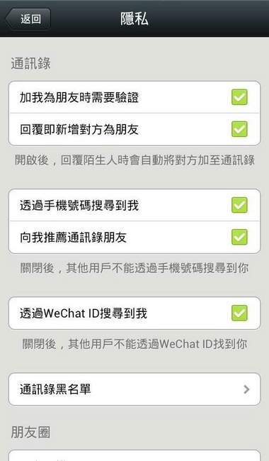 WeChat 不僅方便交友,更注重隱私設定功能,更是唯一可針對交友進行設定的行動通訊App;WeChat 5.0版本全方位讓使用者可限制互動對象,並進一步管理使用者帳戶被搜尋的方式;為強化安全與用戶的掌控性,WeChat提供了各種保護機制,如雙向驗證才能開始聊天、隱藏聯絡人詳情、建立「黑名單」以封鎖其他用戶,並允許使用者關閉 LBS 定位服務功能,只與信任的朋友分享生活!