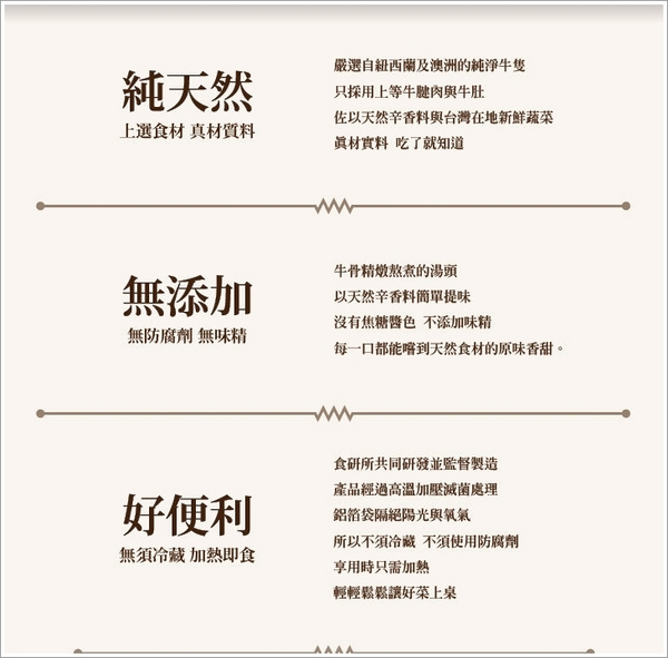 ▲產品的三項主要特色,無添加防腐劑、化學調味劑、味精,皆使用天然食材與辛香料。。