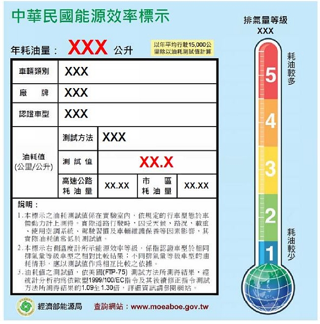 油耗測試方法有分為美國FTP-75與歐盟(1999/100/EC)兩種,因為兩種測試方法不同,所以油耗數據美國FTP-75 會比漂亮,而歐盟油耗測試是比較偏向台灣真實的油耗數據;所以看到油耗先認清是那一種測試方法,再來看需不需要打個折扣。如果看不懂或懶得換算,就直接參考上圖那個像「溫度計」的地方,1級為能源消耗最低、5級則為消耗最高。