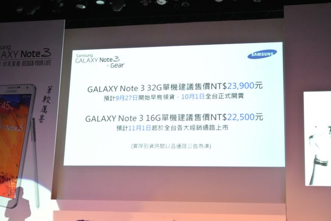 Galaxy Note 3 32G 空機價:NT$23,900。9/27開始早鳥領貨,10/01 全台正式開賣。Galaxy Note 3 16G 空機價:NT$22,500,11/01全台經銷陸續上市。