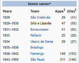 Leonidas da Silva代表巴西國家隊出場19次,攻入21球,是20世紀最重要的球員之一。在他退休後,擔任球評工作,並在聖保羅開設家具店。他晚年因罹患阿茲海默症,在2004年過世。底下表格就是他生涯球隊的成績,相當亮眼。